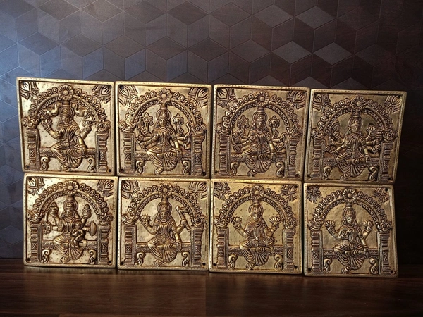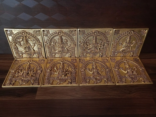 A set of eight square brass panels, each depicting a different form of Goddess Lakshmi, collectively known as Ashtalakshmi. These are specifically designed for door mounting, often referred to as "door panels" or "door mounts."