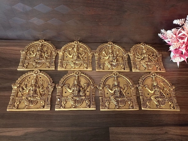 A set of eight brass wall-mounted panels, each depicting a different form of Goddess Lakshmi, known collectively as Ashtalakshmi. These panels are specifically designed for a door, symbolizing a comprehensive invocation of wealth and prosperity.
