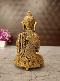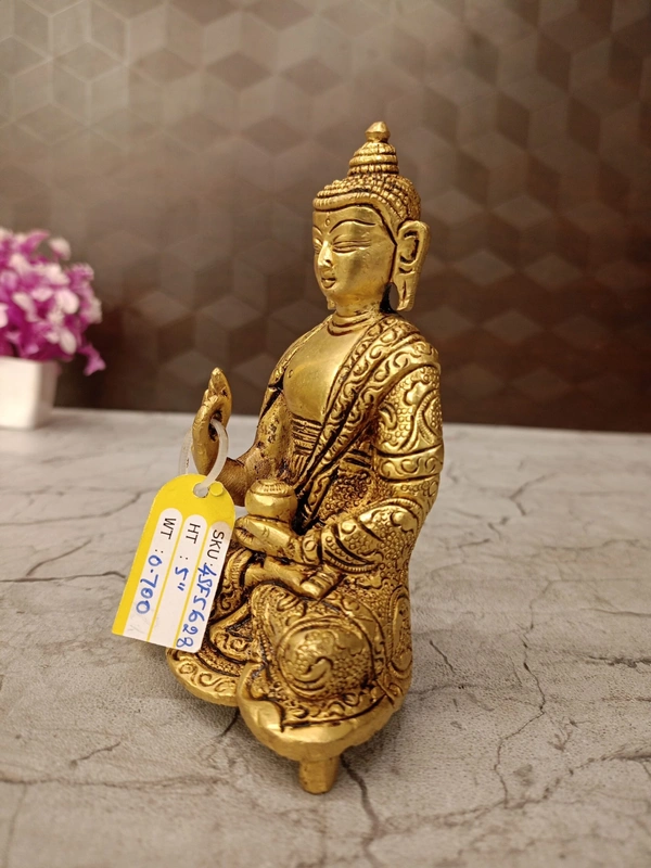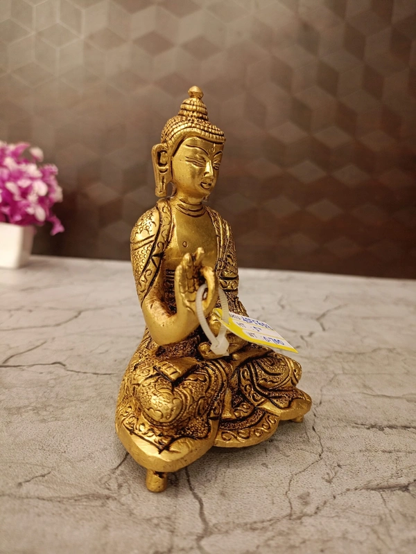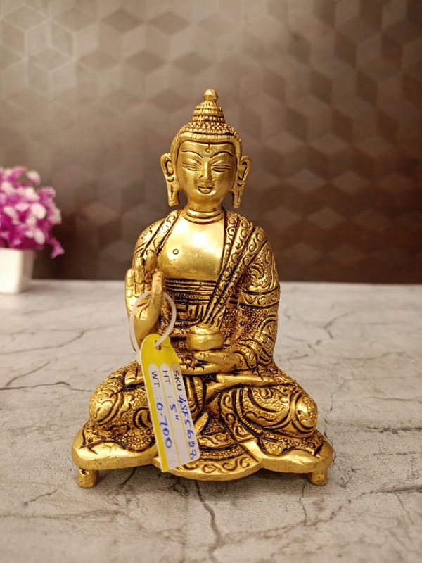 The brass idol you've provided is a classic representation of Lord Buddha in a meditative posture, likely performing the Abhaya Mudra (right hand raised, palm facing outwards, fingers extended upwards) and the Dhyana Mudra (left hand resting in the lap, palm upwards, fingers extended). This combination is highly symbolic and widely used in Buddhist and spiritual practices.