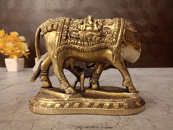 A brass cow and calf idol, often representing Kamadhenu, the divine wish-fulfilling cow in Hinduism, is highly revered and believed to bring numerous benefits to a home or workplace.