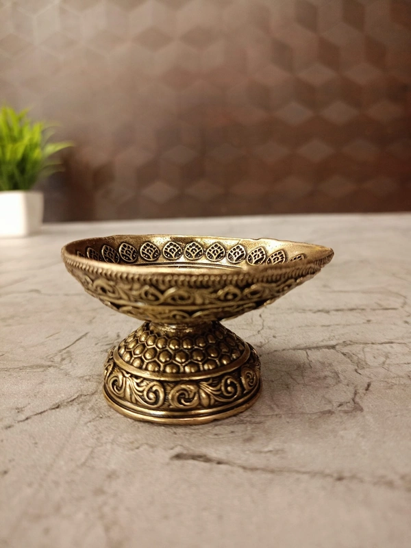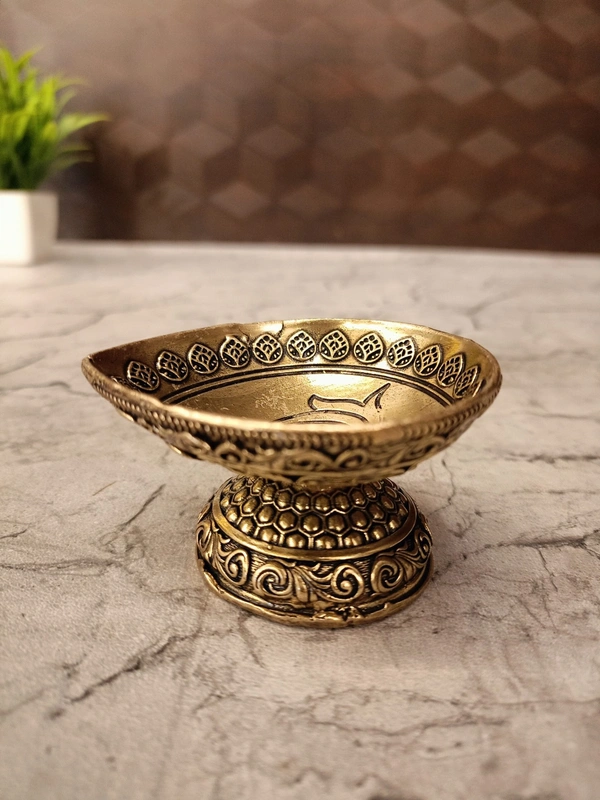 A brass fine art diya, like the one in the image, is a traditional oil lamp primarily used in Hindu religious practices and as a decorative item.