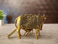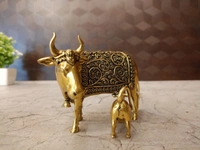 Pooja/Worship: In Hinduism, the cow (Gaumata) is considered sacred and revered as a symbol of motherhood, fertility, abundance, and purity. A cow and calf idol, especially in brass, is often kept in home altars and temples for daily worship, offerings, and prayers. It symbolizes the divine mother and the nurturing aspect of nature.
