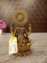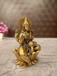 A brass fine art Lakshmi idol, specifically one depicting her seated on a lotus, often with coins or water flowing from her hand (as hinted at by the pot in her lower left hand in the image), is a highly auspicious and widely revered object in Hinduism. Its "fine art" designation emphasizes its detailed craftsmanship, making it both a sacred item and a beautiful decorative piece.
