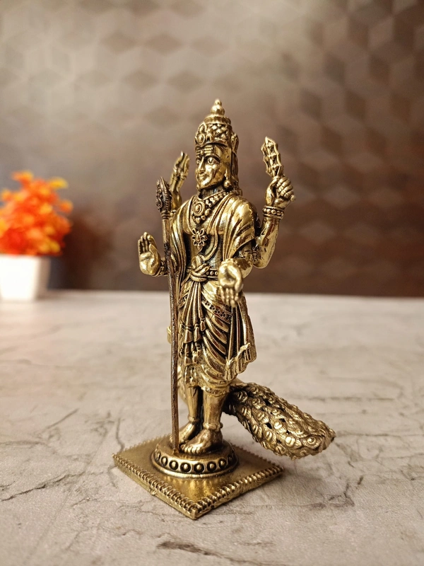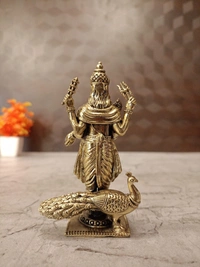 A brass Murugan idol, especially one depicting him with his peacock (his mount) and holding his divine spear (Vel) and other attributes, as seen in the image, is a significant religious and spiritual item primarily used in Hinduism, particularly in South India, Sri Lanka, Malaysia, and Singapore, where Lord Murugan (also known as Kartikeya, Skanda, Subramanya, Shanmukha) is widely worshipped.