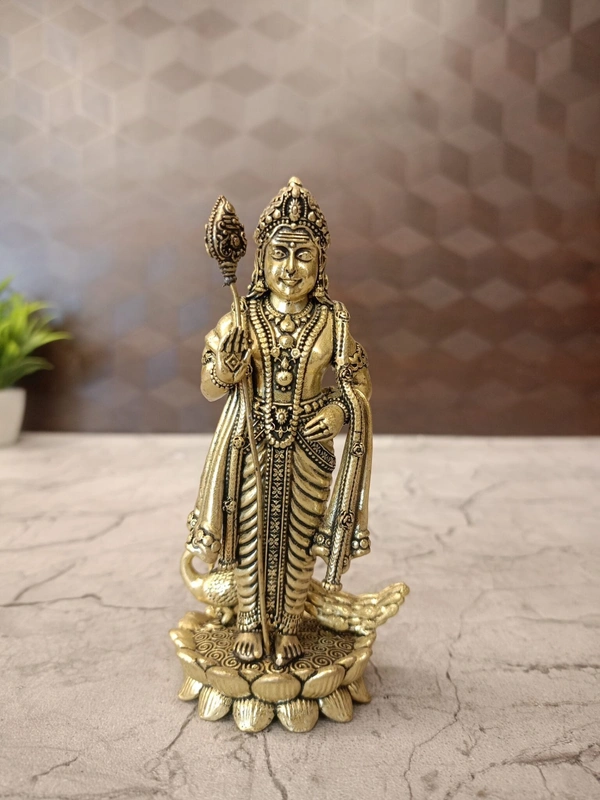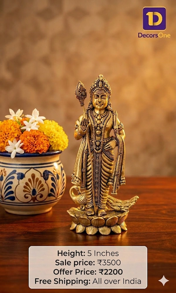 Pooja/Worship: This is the primary and most significant use. Lord Murugan (also known as Kartikeya, Skanda, Subramanya, or Velan) is a highly revered Hindu deity, especially popular in South India (including Coimbatore, where this image is from). This brass idol would be kept in home altars, prayer rooms, or designated sacred spaces for daily worship, offerings (such as flowers, milk, vibhuti), and performing rituals (poojas, abhishekams). Worshipping Lord Murugan is believed to bring blessings for courage, victory over adversaries, wisdom, knowledge, and spiritual growth.
