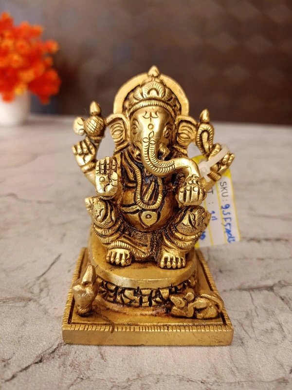 Brass Ganesha statue Sitting On Square base With Kalasam / Anchor Your Home in Divine Tranquility with Our Seated Brass Ganesha Idol
