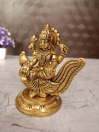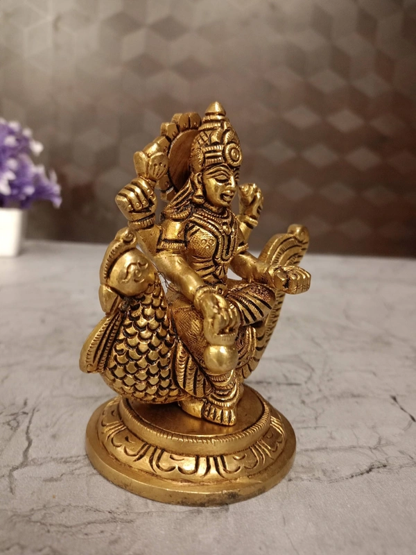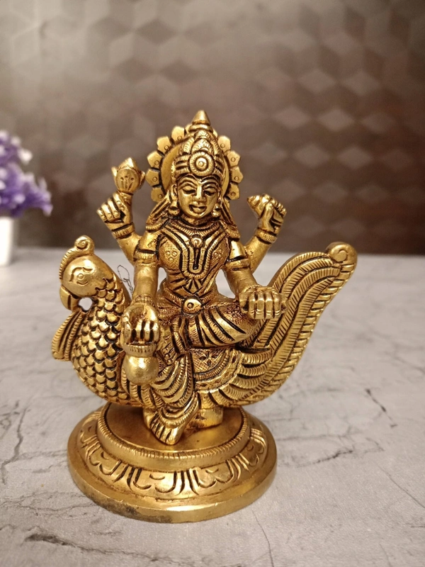The brass idol in the image is a depiction of Gayatri Devi, a highly revered goddess in Hinduism. She is considered the personification of the Gayatri Mantra, one of the most sacred and powerful mantras in Vedic tradition. Gayatri Devi is often described as the Veda Mata (Mother of the Vedas) and the embodiment of all divine energies.