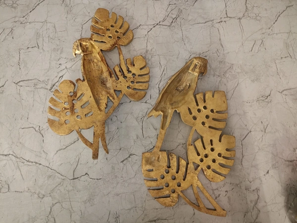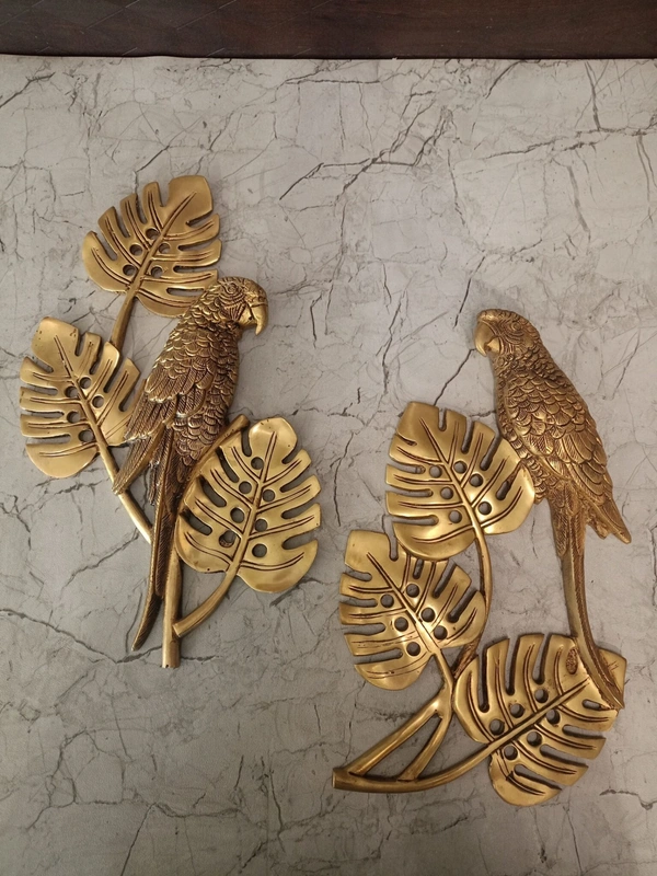 A pair of brass parrots perched on leafy branches, and considering the description "brass Parrot Wall-mount gift home decor," here's a breakdown of its likely usage.