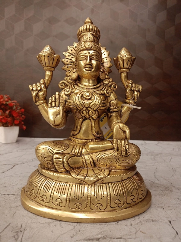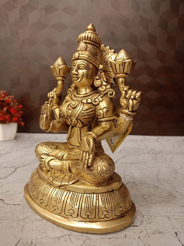 A classic brass idol of Goddess Lakshmi, seated in a meditative posture on a lotus pedestal. This is a very traditional and widely used representation of the deity, embodying prosperity, abundance, and good fortune in its most quintessential form.