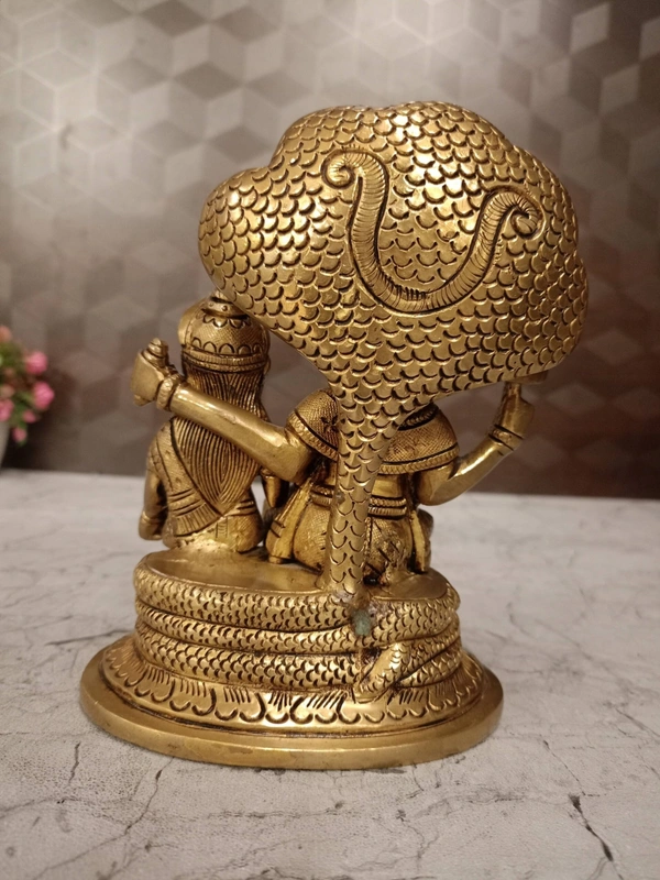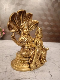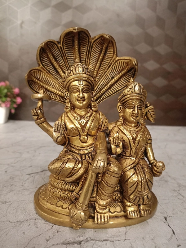 The brass idol set you've uploaded depicts Lord Vishnu and Goddess Lakshmi together, often referred to as Lakshmi-Narayana or Vishnu-Lakshmi. Lord Vishnu is the preserver of the universe, representing dharma, order, and cosmic balance, while Goddess Lakshmi is his consort, the deity of wealth, prosperity, and auspiciousness. The presence of the multi-headed serpent (Sheshnag/Adishesha) providing a canopy over Vishnu is a classic iconographic element, signifying his resting place and cosmic protection.
