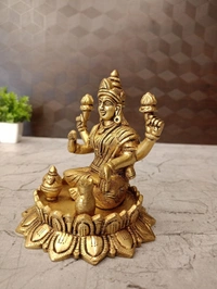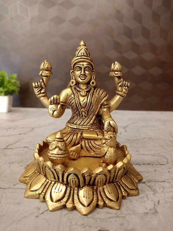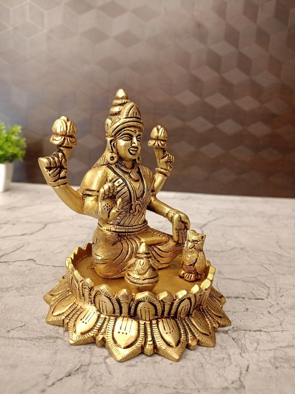 The "usage" of this brass Lakshmi idol is primarily centered around intensive worship for abundant prosperity, deep auspiciousness, and serving as a highly revered decorative and gifting item. The inclusion of the kalasha and owl reinforces her attributes as the bestower and guardian of wealth.
