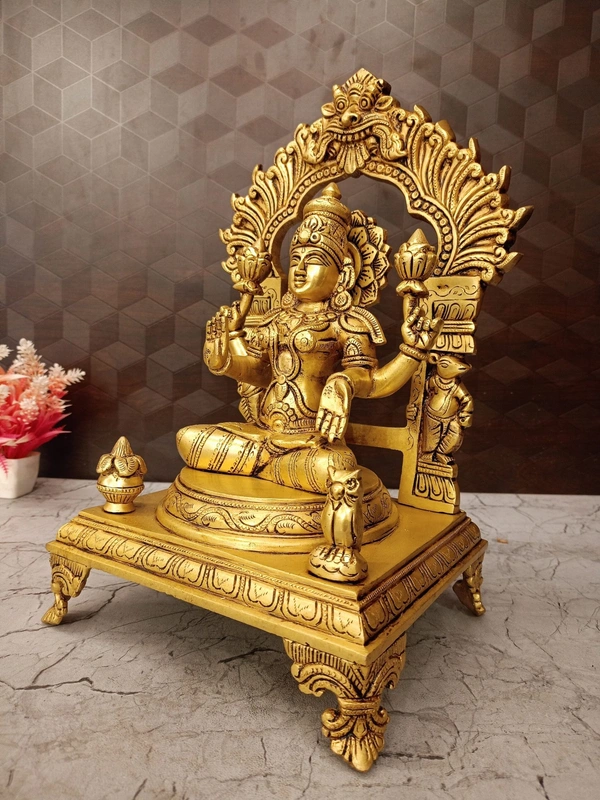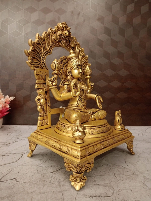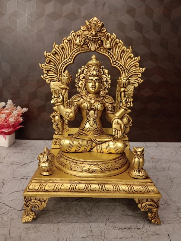 A magnificent brass Lakshmi idol with an elaborate arch (Prabhavali) and accompanying traditional elements like a lamp and an owl (Lakshmi's Vahana, the vehicle). This complete setup signifies a traditional and comprehensive approach to Lakshmi worship, ideal for a dedicated puja altar.