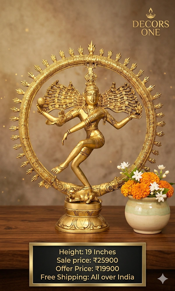 The image shows a large and detailed brass Nataraja idol. This is a powerful and highly symbolic representation of Lord Shiva as the "Lord of Dance," performing his cosmic dance known as the Ananda Tandava.