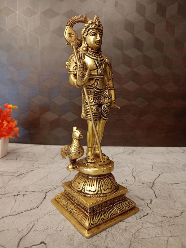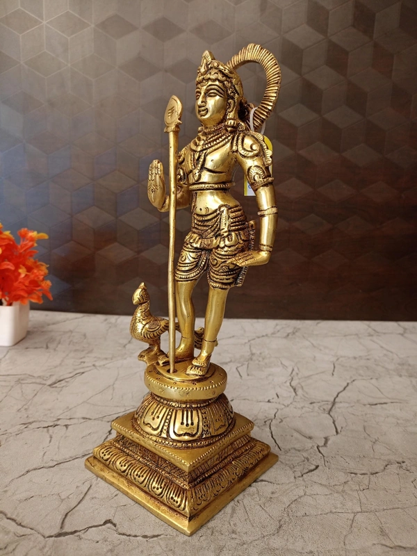 Meticulously handcrafted from premium quality brass by skilled artisans, this idol showcases intricate detailing from the ornate carvings on his attire and jewelry to the serene yet powerful expression on his face. At his feet rests his divine vehicle, the peacock, sculpted with beautiful plumage, symbolizing royalty and immortality. The entire sculpture is mounted on a sturdy, ornate square base that adds to its stability and grandeur.