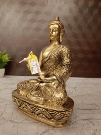 The image shows a beautiful brass Buddha idol in a meditative posture, likely the Bhumisparsha Mudra (earth-touching gesture), where the right hand reaches down to touch the earth, symbolizing the Buddha calling the Earth to witness his enlightenment.