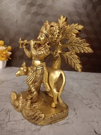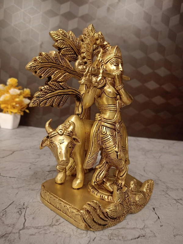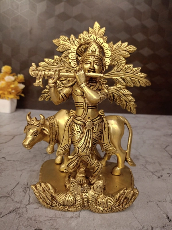 The brass idol in the image depicts Lord Krishna standing under a tree, playing his flute, with a cow beside him. This is a very traditional and beloved representation of Krishna as a cowherd, specifically referred to as Gopala (protector of cows) or Govinda (one who pleases the cows and earth).