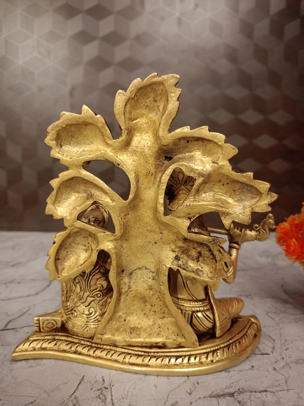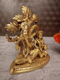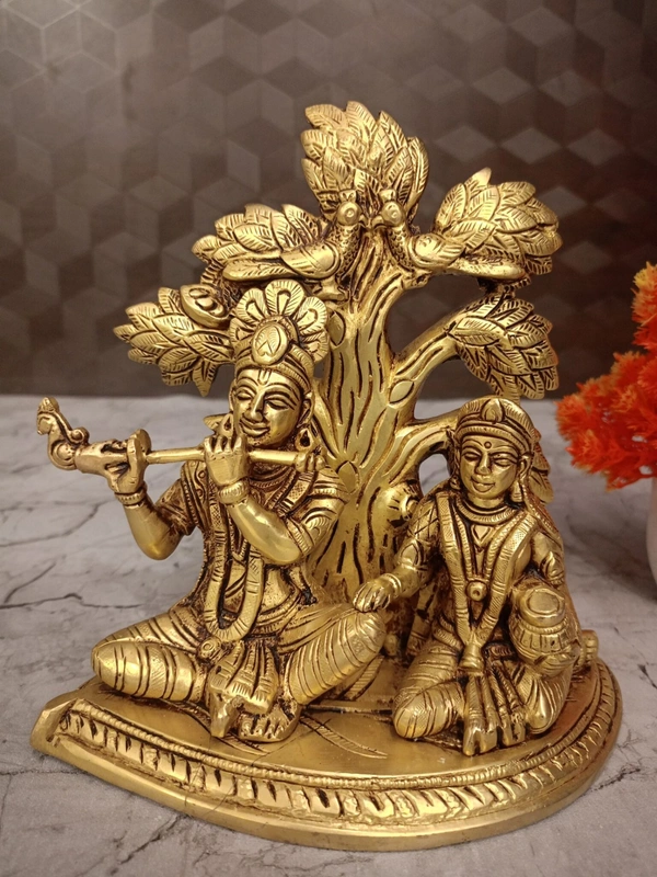 he brass idol in the image depicts Radha and Krishna seated together under a tree, with Krishna playing his flute and Radha often holding a pot or offering a gesture. This particular form, with them seated, emphasizes serenity, divine contemplation, and eternal togetherness.