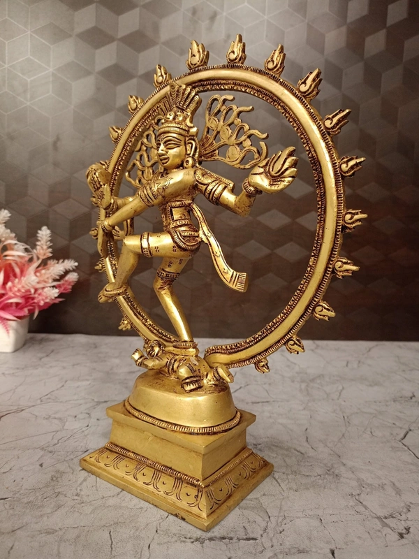 A magnificent brass Nataraja idol, depicting Lord Shiva as the cosmic dancer. This particular piece appears to be well-crafted and detailed, set upon a sturdy, ornate square base. The flame arch (Prabha Mandala) around the figure is also intricately designed.