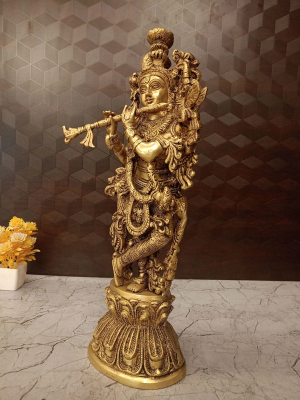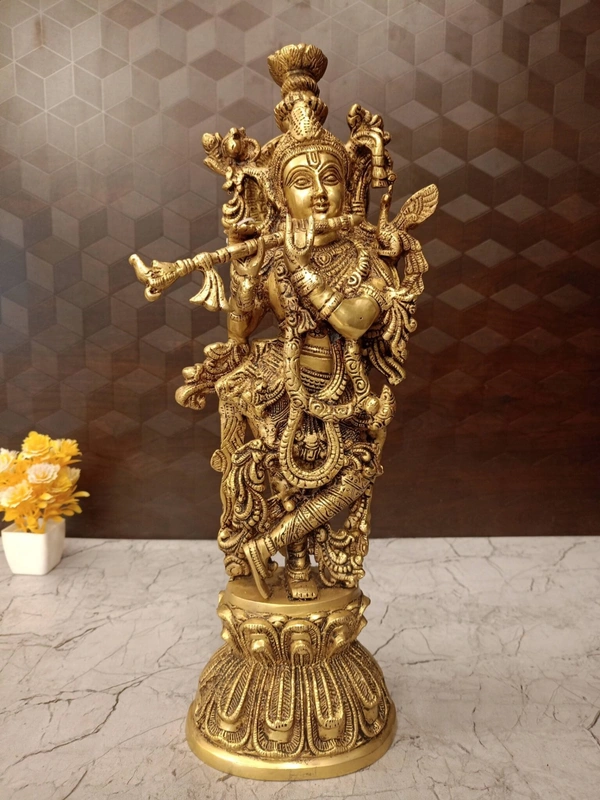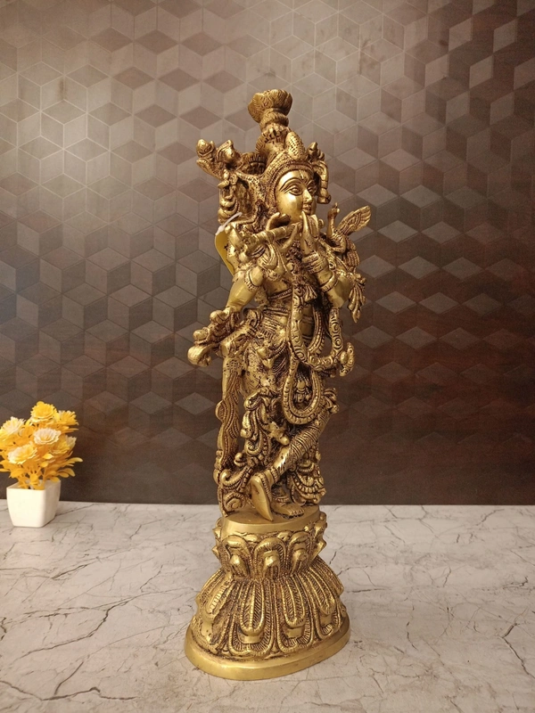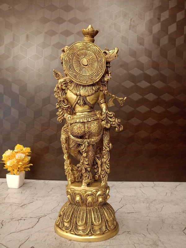 Positive Vibrations: Brass is considered an auspicious metal in Hinduism, believed to attract and radiate positive energy. Placing a Krishna idol is thought to purify the environment and fill the home with peace, joy, and harmony.