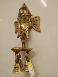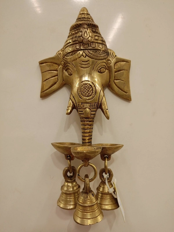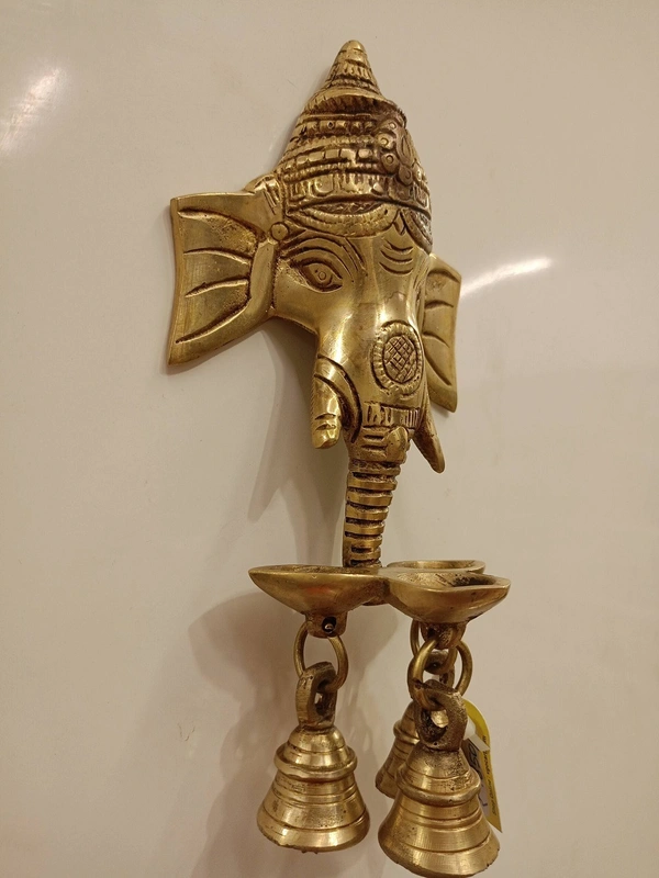 A brass wall-mount Ganesha face with a bell is a popular decorative and spiritual item in Hindu homes.