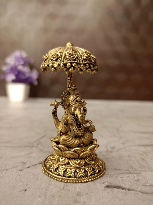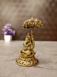 The brass Ganesha idol you've shown is a particularly auspicious one, featuring a key element: the umbrella, also known as a Chatra in Sanskrit. This detail adds layers of symbolic meaning to the already powerful Ganesha idol.