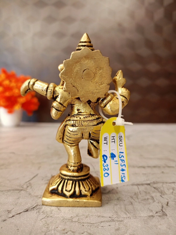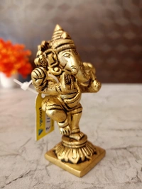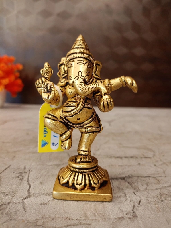 In this dynamic form, Lord Ganesha dances upon a beautifully detailed lotus pedestal, symbolizing purity and transcendence. Our skilled artisans have captured every nuance of this joyful pose—the graceful uplifted leg, the intricate details of his attire, the benevolent expression, and the traditional symbols held in his hands. The fine engravings and warm golden hue of the brass make this a true masterpiece of Indian handicraft.