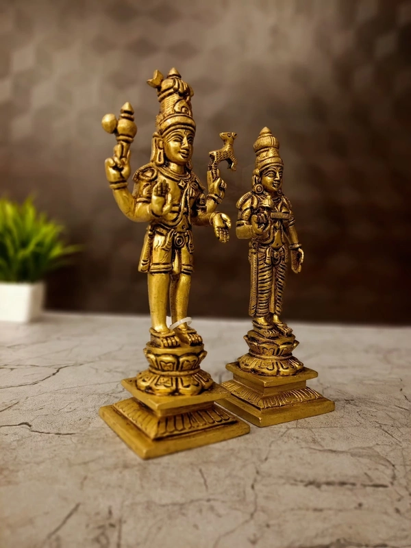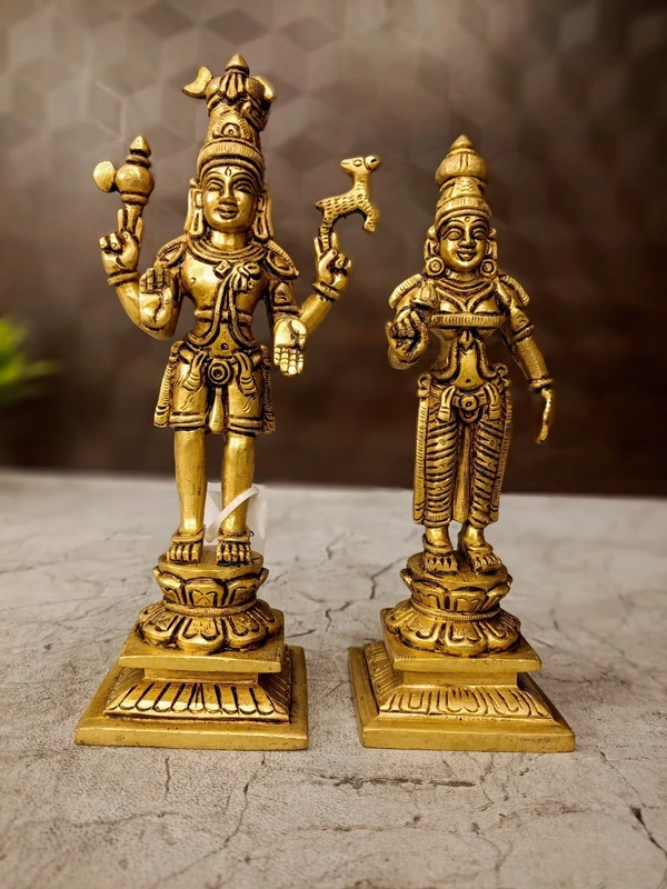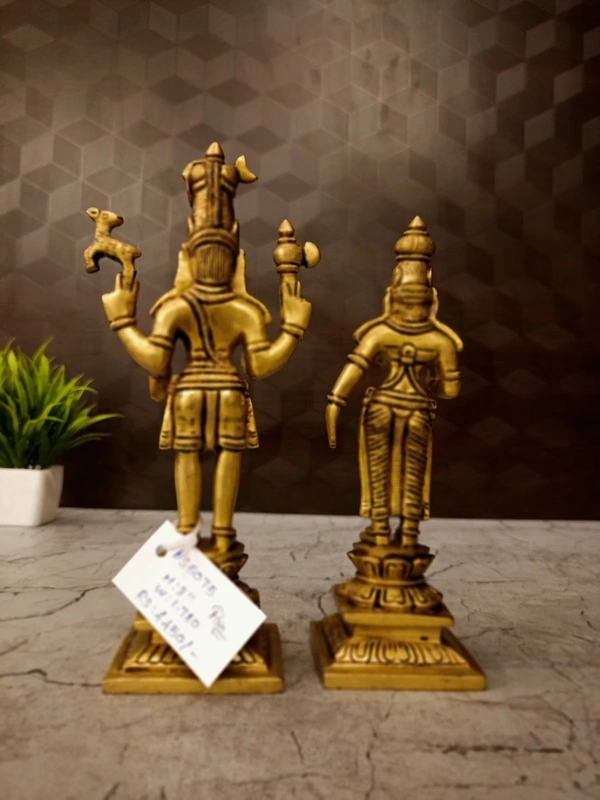 Discover the enchanting beauty of our handcrafted antique Brass Shiva Parvathi Idol, exclusively available at VgoCart. Standing at an elegant 8 inches, this meticulously crafted piece seamlessly blends intricate artistry and divine grace, making it a perfect addition to your home decor collection. Crafted by skilled artisans, this brass idol not only serves as a luxurious decorative item but also exudes a timeless aura of spirituality and devotion.