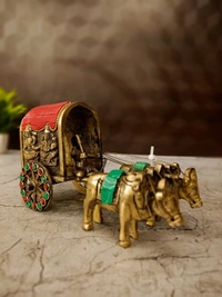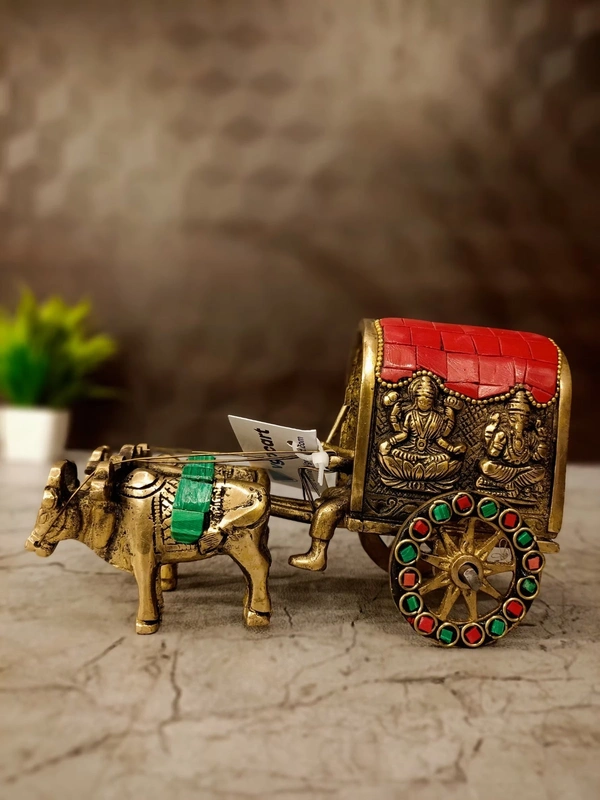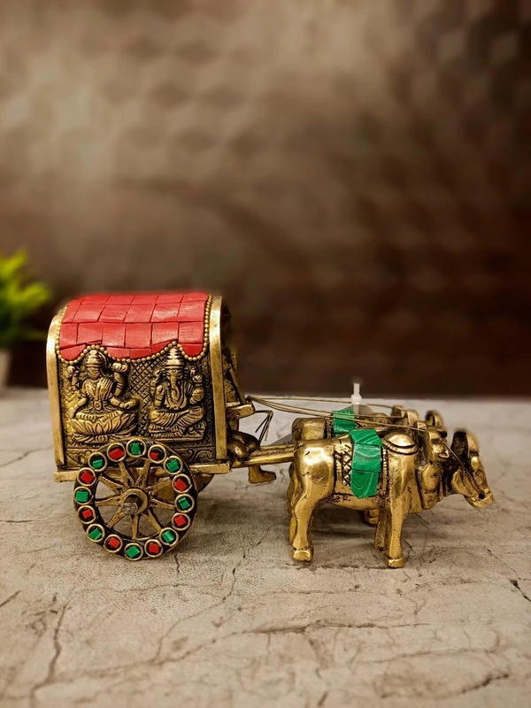 Rooted in rich history, the bullock cart symbolizes prosperity, hard work, and togetherness, making it an ideal item for worship. Beyond its spiritual significance, this Brass Bullockcart serves as an exquisite gift for loved ones, an elegant home decor centerpiece, and a revered addition to your pooja room.